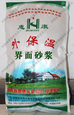 “惠康”界面砂漿,是以進口可再分散乳膠粉作為膠接基料,配以優質骨料以及多種添加劑以科學配比組成的粉狀產品,對墻體和石材、竹子、木、水泥、灰鈣、石膏及有機材料有極強的粘結作用具有良好的耐水性、耐久性及柔韌性,能有效的防止墻面的龜裂。直接加水即可使用,屬綠色環保產品。