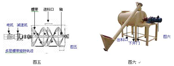 該機(jī)采用臥式筒體(圖五),單軸連起內(nèi)外二至三層螺旋帶,可使生產(chǎn)原料向不同的方向充分混合,外層螺帶和筒體間距離極小,放料后殘留少,臥式機(jī)體下部設(shè)有 下開(kāi)活動(dòng)門(mén),以便更換不同品種時(shí)清掃(圖六)。安裝方便,噪音小,混合效率高,適合各種膩?zhàn)臃?、外保溫砂漿等粉體干混料的生產(chǎn),而且價(jià)格低廉是小企業(yè)投資 較小的理想生產(chǎn)設(shè)備。
